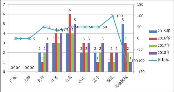 1、2018年及近3年按长度划分机场摆渡车主要区域流向分布比较表(辆,%)