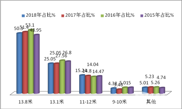 2、13.8米占比最大,且近年呈现不规律----按长度划分2018年1-12月机场摆渡车各长度段销量及占比分析(辆,%)