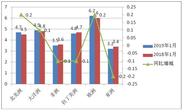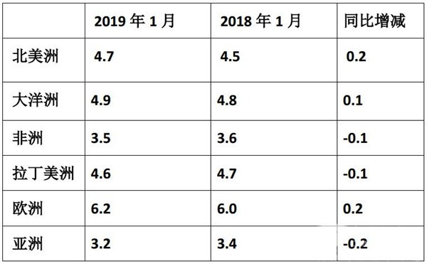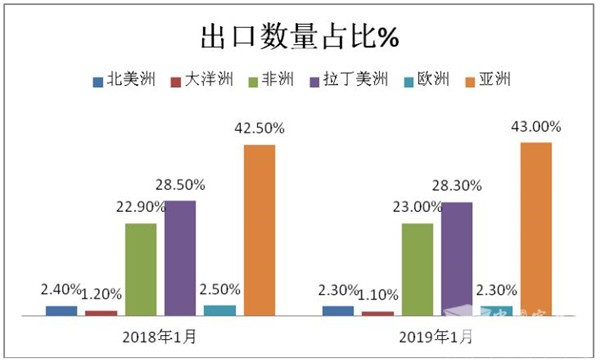 2、从出口金额看,2019年1月亚洲、拉丁美洲及非洲这三大洲的占比为91.9%,比其数量占与去年同比基本持平,说明出口到这些相对不发达的国家的客车档次较低,而出口到欧洲等发展地区的档次相对较高。