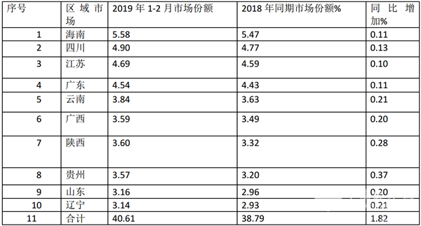 4、前10名销量区域市场份额总和达到38.79%,与2018年同期比集中度提高了1.82个百分点.