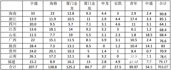 3、旅游客车企业都有自己的优势市场,如宇通在海南、陕西、云南、贵州等区域市场的旅游客车市场份额均超出20%,不愧为中国客车第一品牌;而海格客车在江苏、贵州等地区旅游客车的市场份额较高;厦门金龙在属地福建等市场份额较高;青年客车属地浙江等区域市场表现不俗;中通客车在属地山东表现较好。