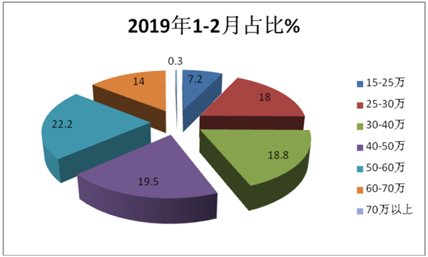 1、2019年1-2月旅游客车主要销售集中在价格在50-60万、30-40万和、40-50万等区间。