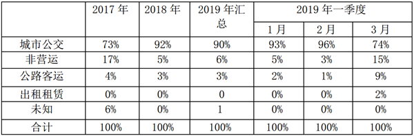 根据中国汽车流通协会市场研究统计数据,2019年1-3月及近2年新能源客车按用途划分销量权重结构如下: