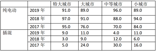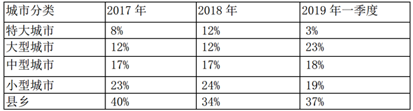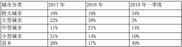 根据上牌信息统计,2019年一季度及近2年同期新能源大中客车流向各类城市权重统计:%
