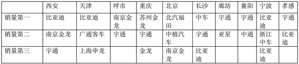 1、 比亚迪纯电动客车在西安(属地西安比亚迪)、天津、宁波等区域市场是老大