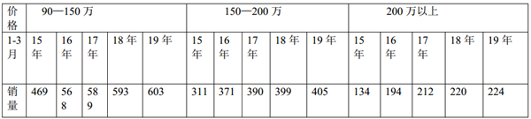 1、2015年 1—3月份到2019年1-3月份,从价格在90万-150万之间的销售情况分析可知一直稳中有升, 2016年一季度同比增幅最大,2017年则增幅收窄,2018年继续收窄,2019年出现恢复性增大