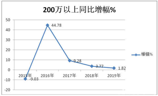 3、2015 1—3月份到2019年1-3月份,从价格在200万以上的销售情况分析可知,近5年同比增幅有正有负,与90-150万和150-200万两个价格区间的客车市场规律有所不同。