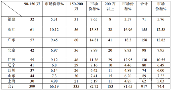 4、在200万以上价格区间,90万以上高档客车集中度次高,达到81.65%,留给其他区域市场的机会有18.35%,这给国内生产高端客车的客车企业在目标市场定位和制定区域市场营销策略方面都提供了有力的依据。