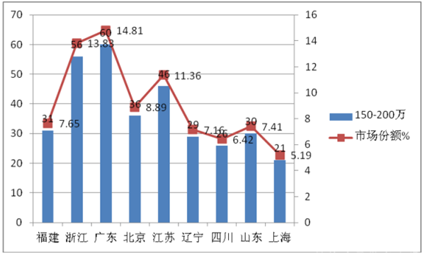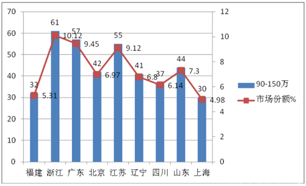 具体为:价格在90-150万区段的需求的集中度是9.45%;对价格在150-200万的区段的需求的集中度是14.81%;对价格在200万以上的区段的需求的集中度是18.3%,.可以看出90-150万、150万-200万及200万以上的高端客车市场主要分布在广东区域,因此,高端客车生产企业对广东区域的营销策略尤其重要,因为该区域对高端客车市场需求的机会最大.根据市场调研,浙江金华青年尼奥普兰就占据了广东区域近40%的高端客车市场,宇通、安凯客车占据了将近30%多的市场份额。