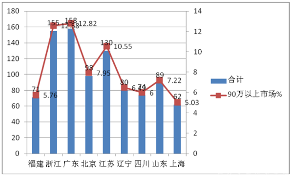 1、福建、浙江、广东、北京、江苏等9个区域市场是90万以上高档客车市场的主要需求市场,集中度比较高。需求比例占整个高档客车市场的74.4%。