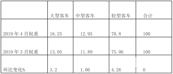 根据中汽协数据,2019年4月大中轻客车权重环比统计: