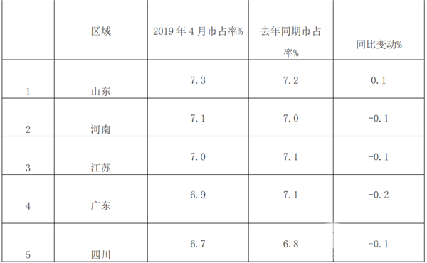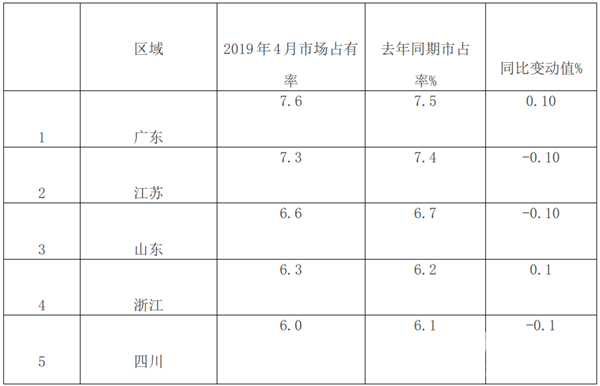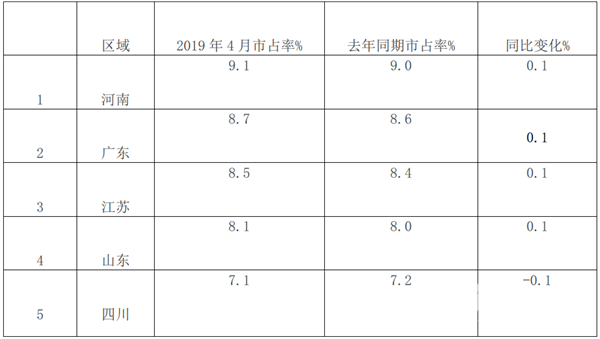 1、根据上牌信息统计计算,2019年4月,全国重点区域大型客车市场份额统计表: