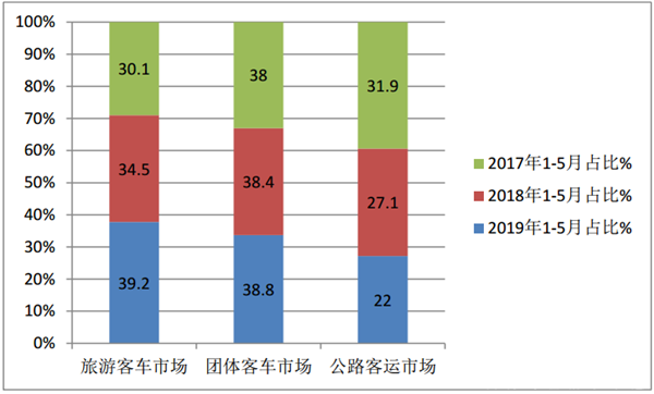 根据数据统计,2019年1-5月及近2年同期公路客车各细分市场占比如下: