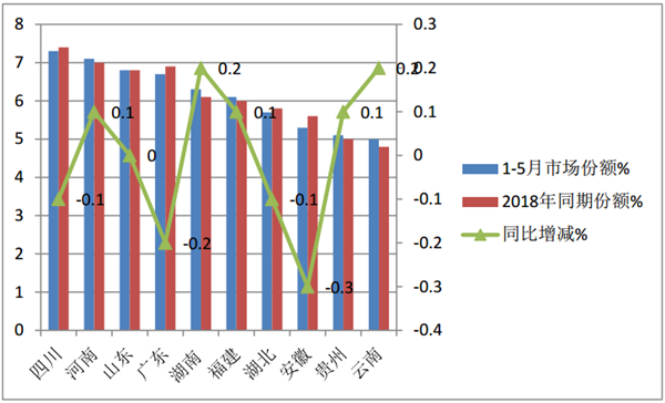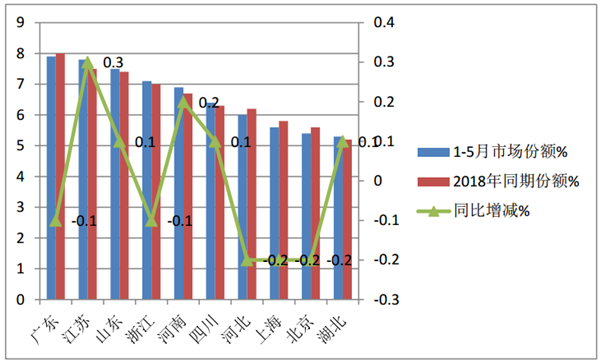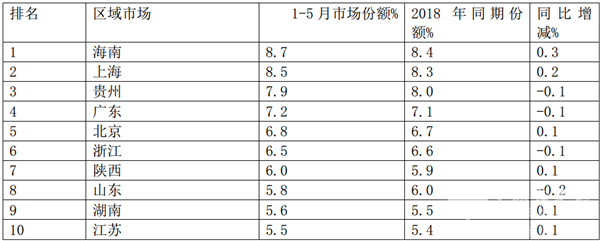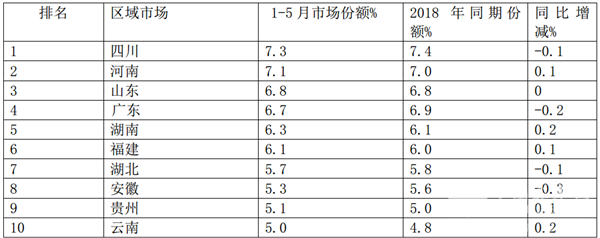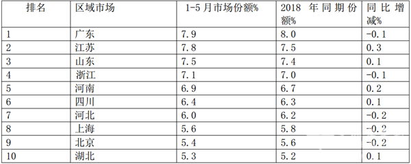 根据数据统计,2019年1-5月,全国前10个区域公路客运市场客车占有份额如下: