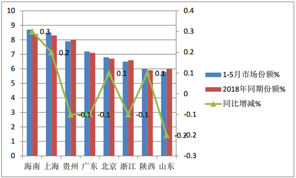 根据数据统计,2019年1-5月旅游客车前10名区域市场市占率如下表: