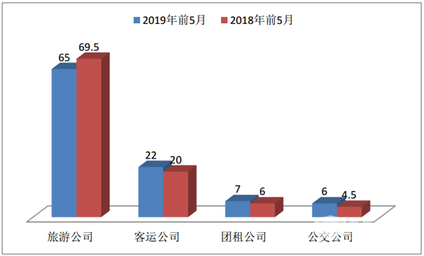 根据调研,2019年1-5月,作为增幅最大、占比最大的公路客车中的细分市场---旅游客车,其经营主体正在发生变化,即由原来的占主体的旅游客运公司逐步向客运公司、团体租赁公司、公交公司等扩散(具体占比变化见下图---旅游客车经营主体结构分布变化),也就是说,经营旅游客运的单位多了,不再由哪一家能够垄断的了。