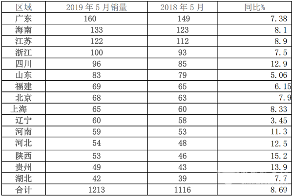可见,2019年5月前10名区域市场的集中度为81.1%,同比增长1.1个百分点,说明2019年5月重点市场垄断程度增加。