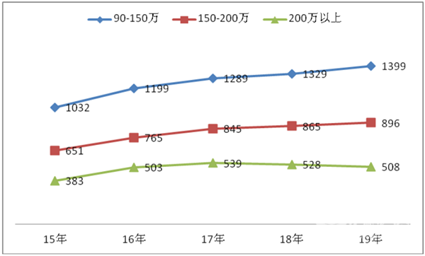 2、在2019年上半年的高端客车市场中,价格在90—150万之间的产。市场容量在90万以上高档客车中仍然是最大的,这一点仍然延续了近年的惯性发展规律。尽管近5年中除一直呈现了一定的增长态势,但市场需求的数量也很有限,这主要与目标市场经营者的购买力和回报率等因素有关,但增长的趋势有越来越弱的态势。