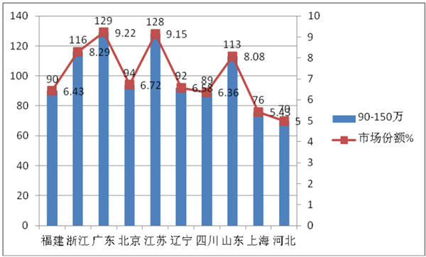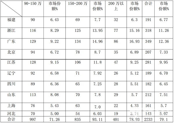 1、福建、浙江、广东、北京、江苏等10个区域市场是90万以上高档客车市场的主要需求市场,集中度比较高。需求比例占整个高档客车市场的79.1%,其他23个区域市场销售高端客车仍有近21%的市场机会,在90-150万的价格区间,集中度为71.26%,说明在该细分市场重点区域的垄断程度不是很高,留给其他区域的机会相对较大,其他区域的机会不到29%;150-200万的价格区间的集中度为93.11%,留给其他区域的机会不到7%;200万以上的集中最高度为78.93%留给其他区域的机会仍然有21%。也就是说,90万以上高档客车在200万以上区间集中度次高,90-150万集中度最低,150-200万区间最高。