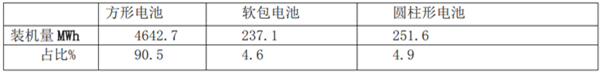 五、从电池类型来看,方形电池装机量4642.7MWh、占比90.5%,软包电池装机量237.1MWh、占比4.6%,圆柱电池装机量仅有251.6MWh,占比4.9%。