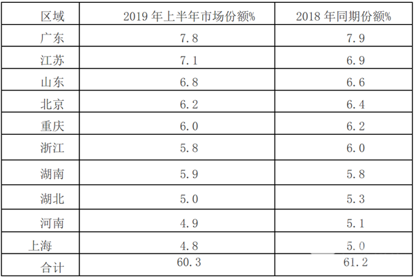 上表表明,2019年前6月混合动力客车重点流向广东、江苏、山东等10个重点区域市场,前10个重点区域混合动力客车的市场占有率为60.3%,同比2018年的61.2下降了0.9个百分点,说明重点区域的垄断程度有所减弱。
