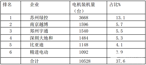 2、1-7月新能源专用车前6名电机装机量,苏州绿控占据的份额最高,为13%;前6名累计占据37.2%的份额,垄断程度较低,竞争较为分散