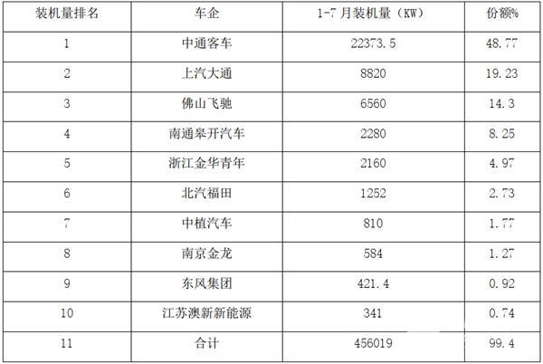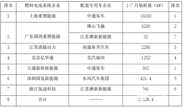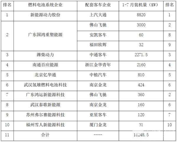 可见,在2019年前7月搭载氢燃料客车电池系统方面: