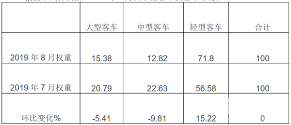 根据中汽协数据,2019年8月大中轻客车权重环比统计: