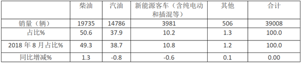 根据上牌信息,2019年8月按燃料种类划分,客车销量结构特征如下: