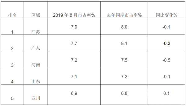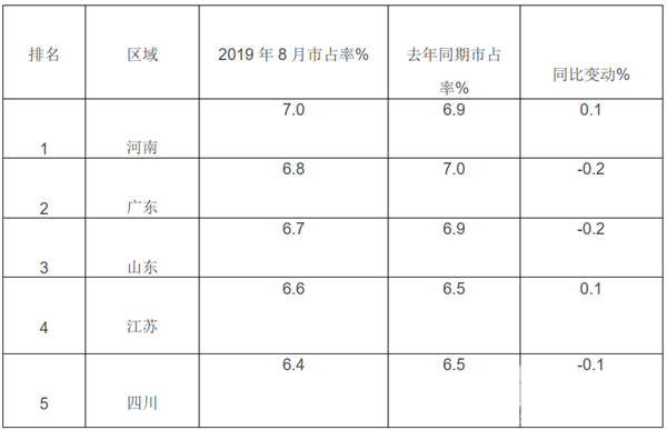 可见,在2019年8月,中型客车区域流向中,河南占据的份额最大,其次是广东和山东区域。