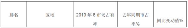 1、根据上牌信息统计计算,2019年8月,全国重点区域大型客车市场份额统计表