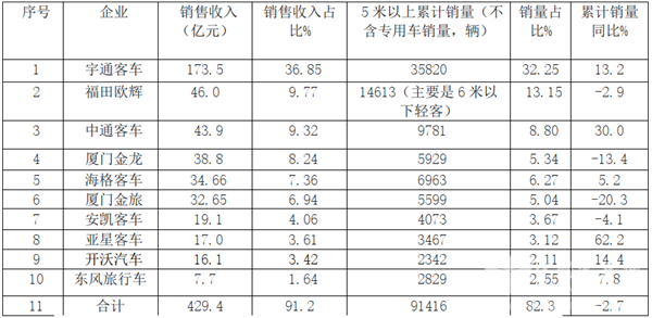 根据数据统计,2019年8月前10名车企客车销售收入及占比统计: