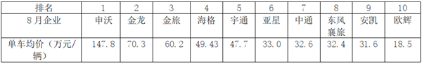 1、8月申沃单辆客车平均售价最高,据了解申沃主要是生产销售大型纯电动公交客车,主要销往属地—上海,政府买单较多,因此单价较高。