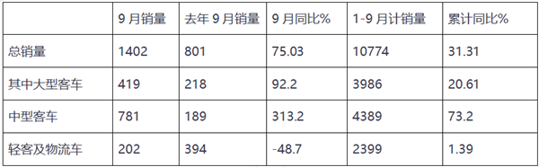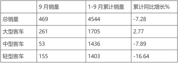 根据福田汽车10月10日发布的公告,其9月及1-9月客车销量如下(不含非完整车辆):