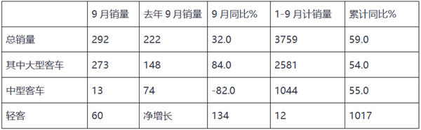 2、9月新能源客车销售192辆,同比增长123.36%,表现突出。