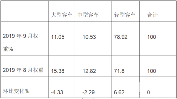 根据中汽协数据,2019年9月大中轻客车权重环比统计: