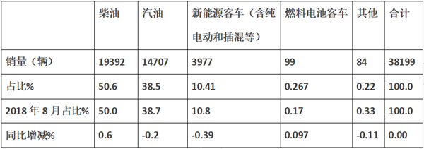 根据上牌信息,2019年9月按燃料种类划分,客车销量结构特征如下: