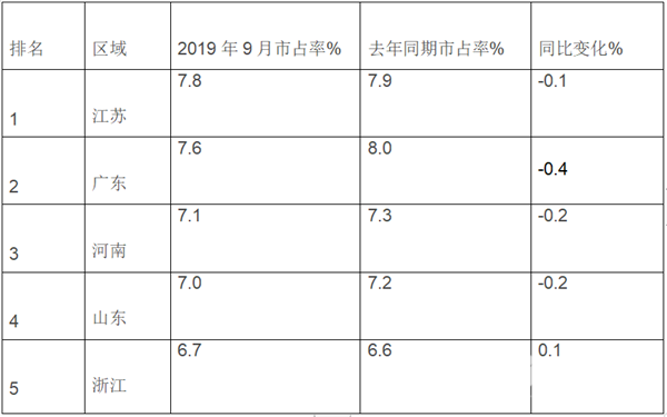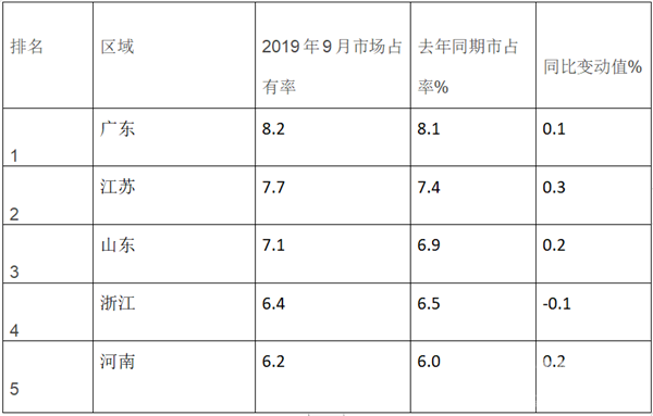 1、根据上牌信息统计计算,2019年9月,全国重点区域大型客车市场份额统计表: