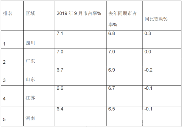 可见,在2019年9月,中型客车区域流向中,四川占据的份额最大,其次是广东和山东区域。