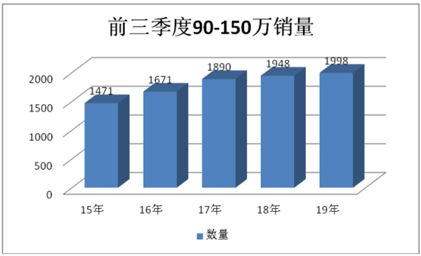 1)2015年1—9月份到2019年1-9月份,对价格在90万-150万之间的销售情况分析可知,此区间的客车销售各个年份都呈现上升趋势,尤其是2015年增幅最大。近5年来前三季度价格在90-150万区间客车销量增长和增幅情况(表4)
