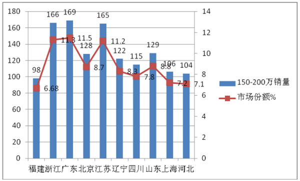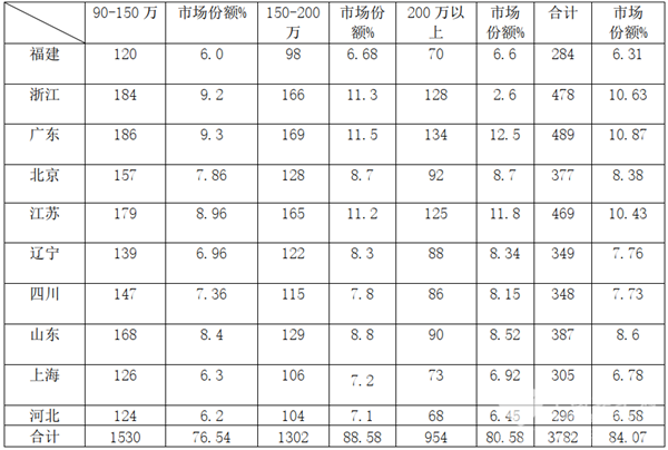 1、福建、浙江、广东、北京、江苏等10个区域市场是90万以上高档客车市场的主要需求市场,集中度比较高。需求比例占整个高档客车市场的84.07%。也就是说,到其他23个区域市场销售高端客车仍有近15.93%左右的市场机会,在90-150万的价格区间,集中度为76.54%,留给其他区域的机会相对减小,,其他区域的机会不到24%;150-200万的价格区间的集中度为88.58%,说明在该细分市场重点区域垄断程度较大,留给其他区域的机会不到12%;200万以上的集中最高度为80.58%。也就是说,90万以上高档客车在150-200万区间集中度最高,90-150万集中度最低,200万以上区间次高。充分说明,150-200万价格区间的客车市场竞争最不充分,而在90-150万价格区段的高档客车竞争却最为分散。