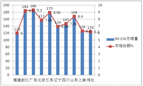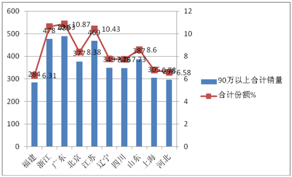 三、粤、浙、苏位居前三甲;前10名重点区域市场集中度达到87.48%,各价格细分市场的集中度随着价格提高而增大