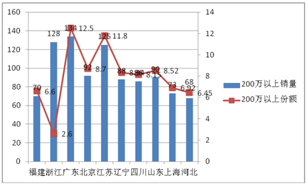 3、从价格细分市场来看,广东市场是90-150万价格销量最大的区域,其次是浙江,再次是江苏;同时广东还是150-200万销量最大的区域,其次是浙江,再次是江苏。广东仍然是200万以上客车销量最大的区域,其次是浙江,再次是江苏。可见。价格细分区间销量与总销量的规律分布稍有差异。