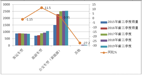 1、2019前三季度,同比旅游客车增长数量最多,是推动高档客车大幅度增长的最大动力。