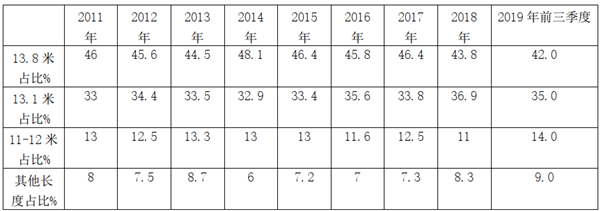 2、13.1米段占比为始终占据在35%左右的市场权重,为次大。