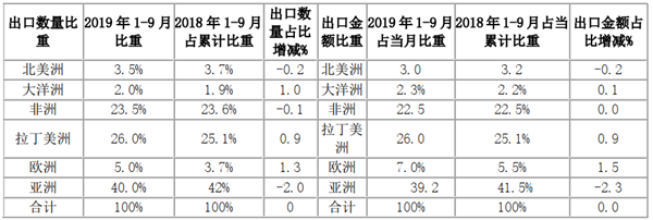 1、上表数据表明,2019年1-9月,我国客车出口主要集中在亚洲、拉丁美洲和非洲,这三个大洲出口数量占比为近90%左右。