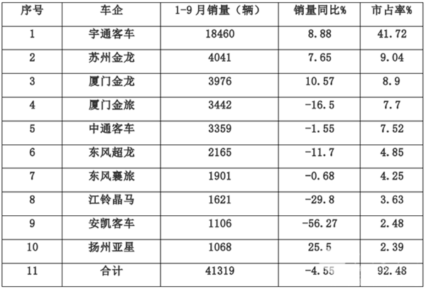 根据中国客车统计信息网,2019年前三季度前10名车企座位客车销量、同比及市场占有率(剔除5-6米卧铺与其他车型、剔除北汽福田、厦门金龙、苏州金龙、厦门金旅4家企业2019年前三季度和2018年同期的海狮类轻客车型、及中通客车6-7米物流车销量):