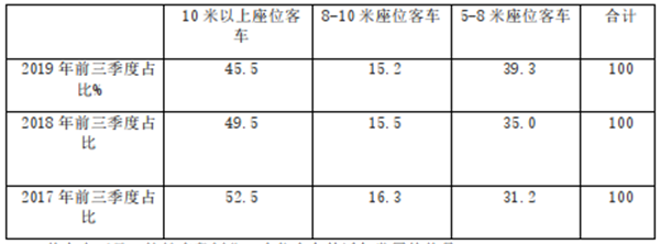 根据中国客车统计信息数据,2019年前三季度各细分市场客车销量及占比: