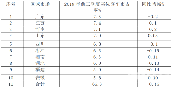 可见,在2019年前三季度,前10名区域市场座位客车市场份额及同比: