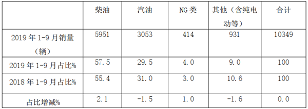 根据上牌信息,2019年1-9月7-19座农村小客运车型按动力种类划分销量结构: